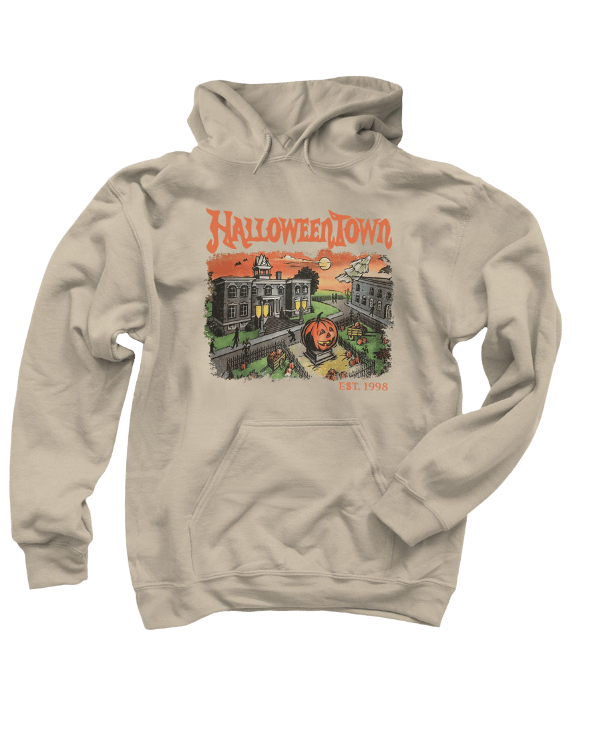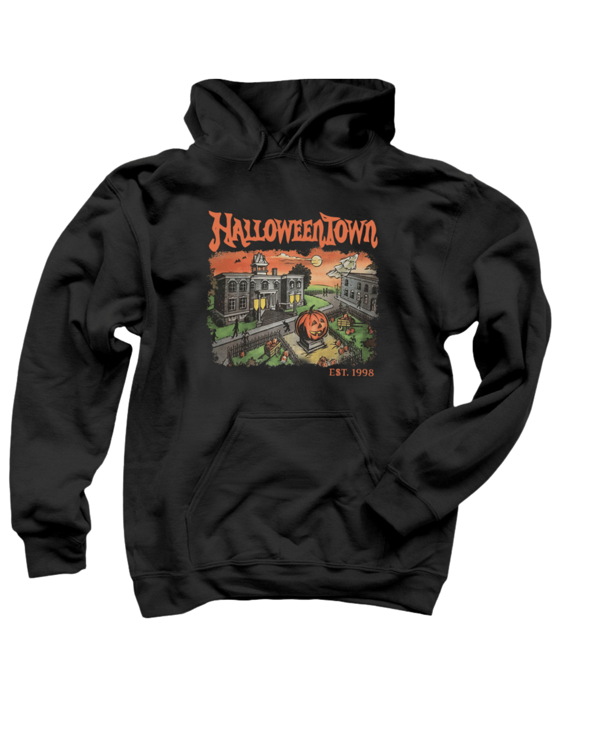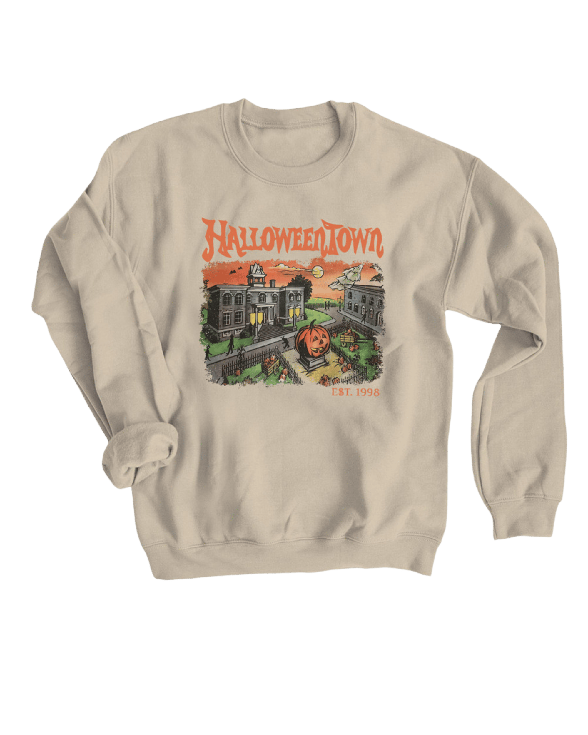 Celebrate spooky season all year round with this cozy sweater featuring a classic Halloween Town backdrop !